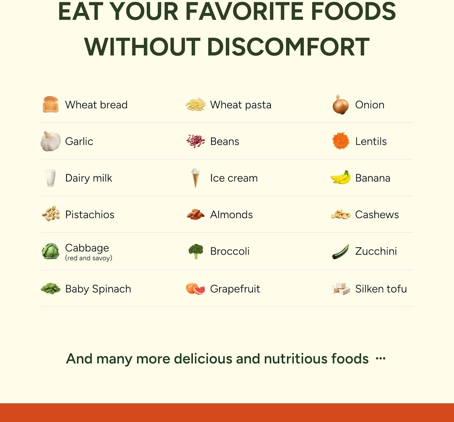 - Alpha-galactosidase:Targets GOS (galacto-oligosaccharides) present in beans and legumes, aiding digestion.